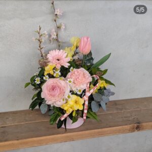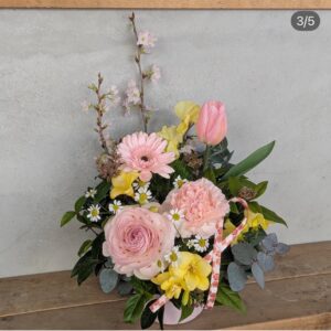 ピンクのラナンキュラスやチューリップ、菜の花などの黄色の花、枝物等をいれてお作りいただきます。