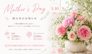 💐 母の日のお知らせ 5月10日は母の日です。 プントでは花束やアレンジメントのほか、かわいい花鉢やプリザーブドフラワーなどもご用意しております。 ご予算やイメージをお伝えいただければ、お客様だけの特別な … 続きを読む 2026年 5月10日「母の日」